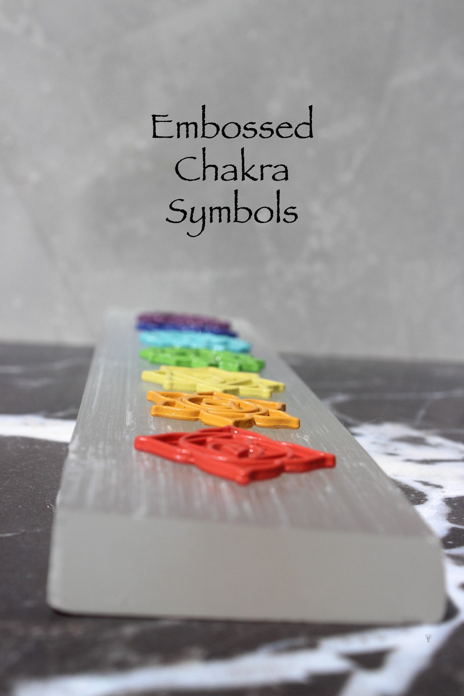 7 Chakra Satin Spar Charging Plate | 8 inch Selenite Wand with Embossed Chakra Symbols | Satin Spar Log | Tons of Soul