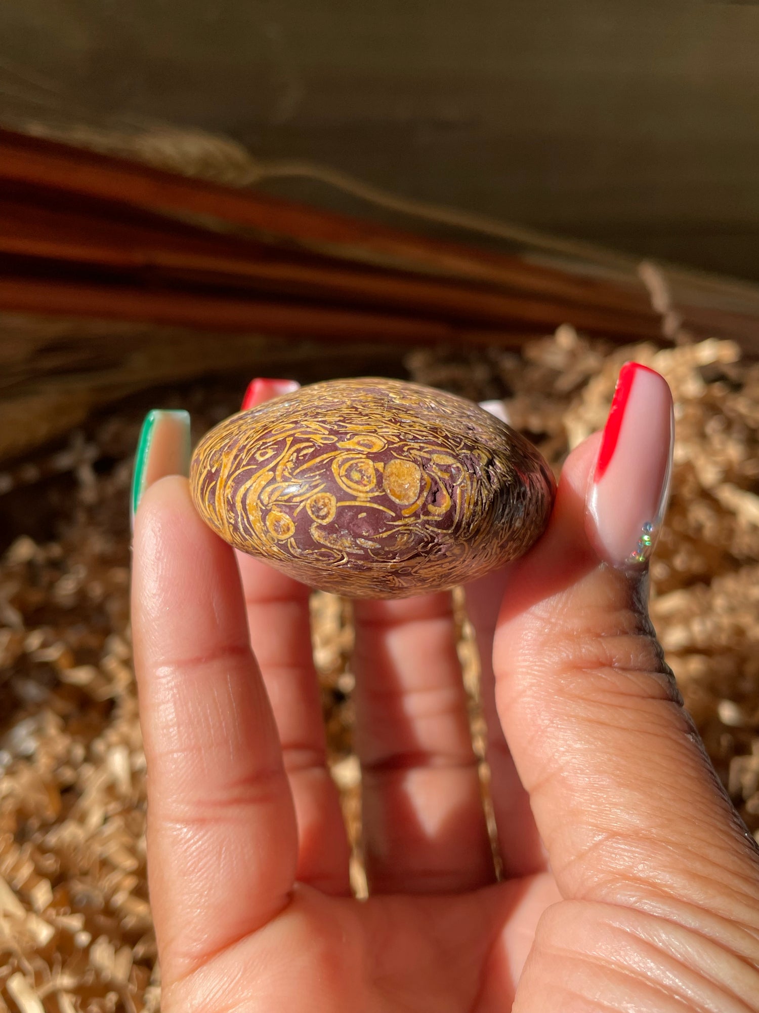 Also known as “Arabic Stone”, “Elephant Jasper”, “Miriam Stone”, and “Cobra Stone”, Calligraphy Stone is called so because of the fossilized shells on it which appear like calligraphy. It’s lightly polished to persevere its natural texture.