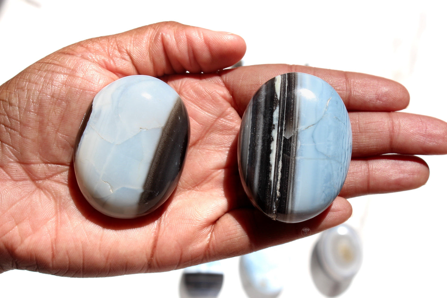 Metaphysical Properties: Owyhee Blue Opal is associated with calming, soothing, and emotional healing properties. When used as a palmstone, it is believed to promote relaxation, reduce stress, enhance communication, and support spiritual growth.